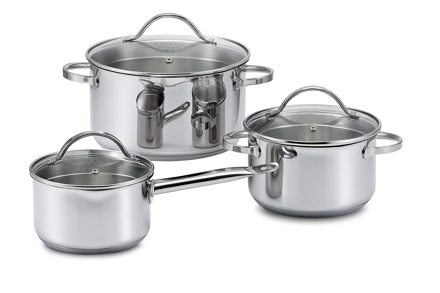 Престижний набір каструль з високоякісної нержавіючої сталі марки 18/10(АISI 304), кожна позиція має: багатошарове термоакумулююче дно з вплавленим алюмінієвим диском; надійно припаянні металеві ручки, що витримують трикратне навантаження, легко миються і мають дуже низьку теплопровідність, завдяки чому не перегріваються; нанесену мірну шкалу; прозорі жаростійкі кришки з перфорацією для зливу води. Загальна вага в коробці - 4600 гр. Даний набір посуду підходить для використання на всіх видах плит, в тому числі індукціїних. Миття в посудомийних машинах - можливе.